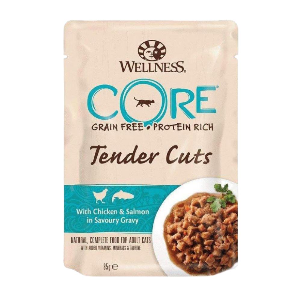 طعام رطب عالي الجودة للقطط، يحتوي على قطع طرية من لحم الدجاج والسلمون في صلصة شهية. تركيبة خالية من الحبوب وغنية بالبروتين، مصممة لدعم الصحة العامة والهضم السليم لدى القطط البالغة.